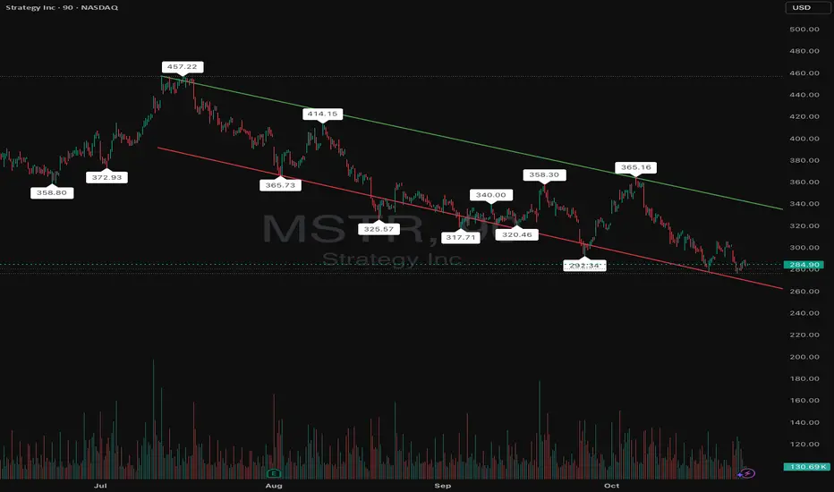 MSTR (MicroStrategy Inc.) is trading within a well-defined descending channel that has persisted since July. The stock continues to make lower highs and lower lows, reflecting a strong bearish trend. It is currently testing the lower channel support around the $284–$285 area, a zone that has previously triggered short-term rebounds. If MSTR can hold this level and reclaim $300, a potential bounce toward the mid-channel region around $320–$340 could follow. However, a breakdown below $280 may signal further downside toward $265 or even $250. Overall, the stock is at a critical inflection point where traders are watching to see whether the support holds or the downtrend resumes.