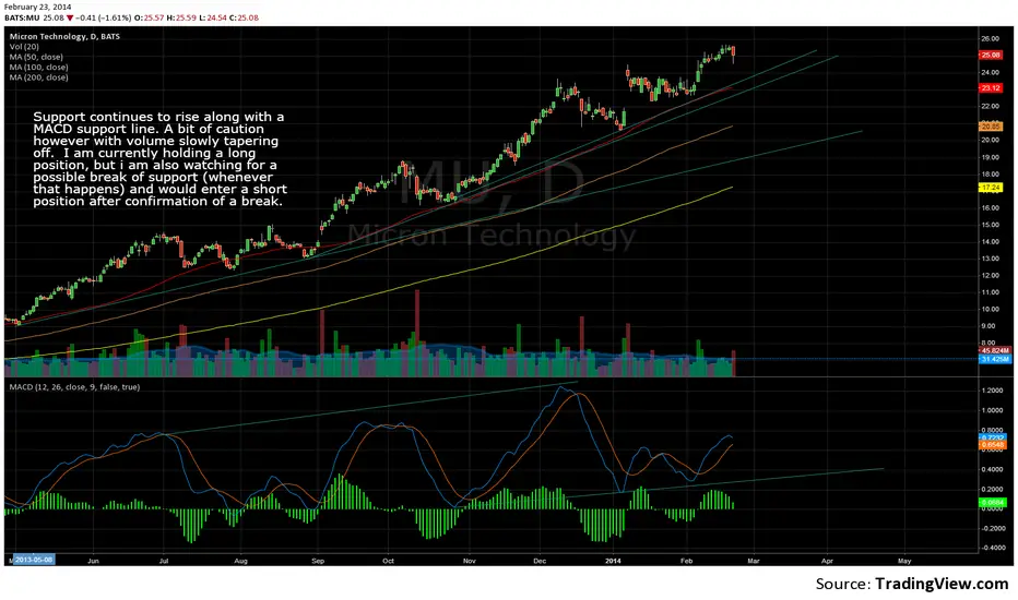 Support continues to rise along with a MACD support line. A bit of caution however with volume slowly tapering off. I am currently holding a long position, but i am also watching for a possible break of support (whenever that happens) and would enter a short position after confirmation of a break.