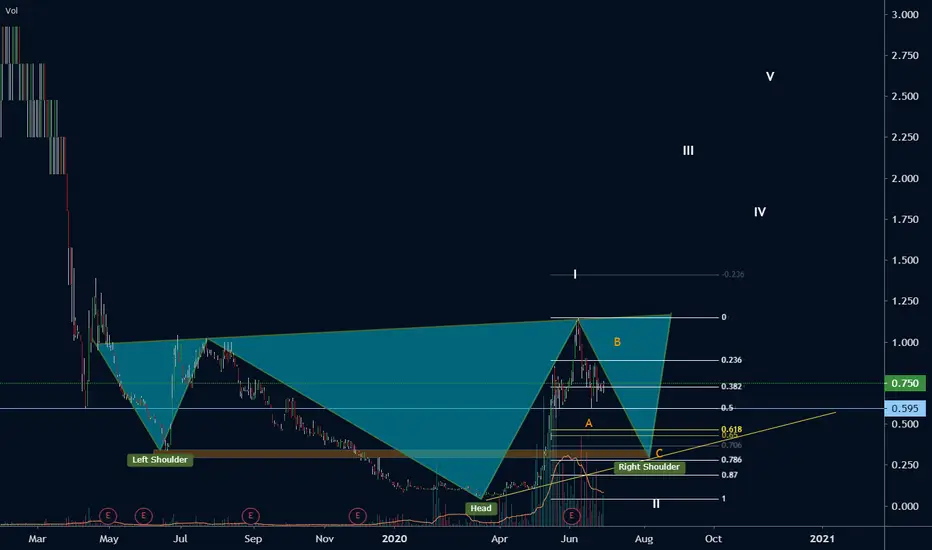 Now if this hns matures I believe 0.3 is a logical spot for a right shoulder for a ihns it will be along the trend line and the area seems to have been a significant point horizontal S/R which coincides with .786 fib as well. Traditional SL of playing a HNS would be to use the head as a SL, but in this case that would be too Large for me to risk so ill wave for confirmation and sell if the trend line breaks. In addition it may also be the start of wave 3.