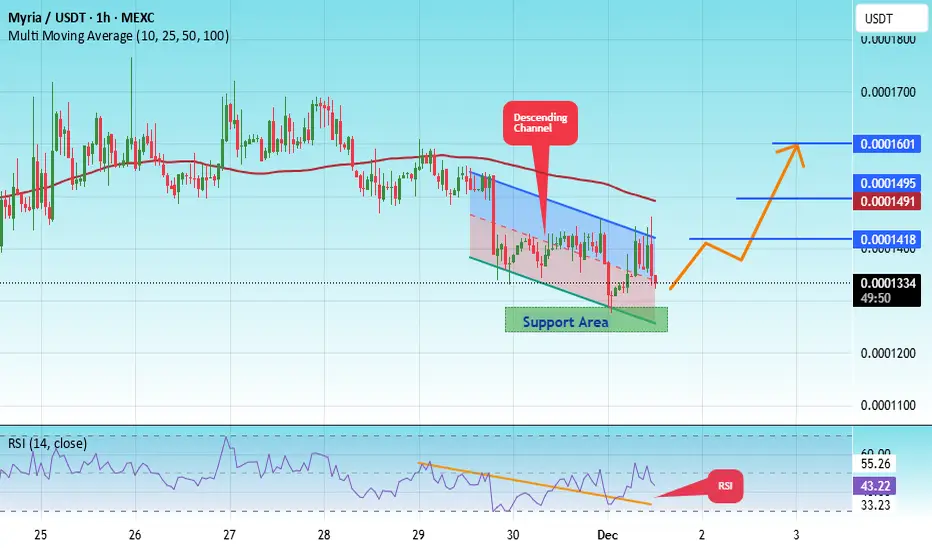 The price is moving in a descending channel on the 1-hour timeframe. It has reached the lower boundary and is heading towards breaking above it, with a retest of the upper boundary expected.