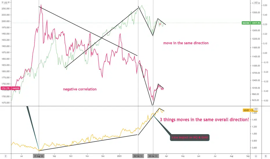 What I observed for the past few days is that the pattern may not work again. The correlation seemed to turn from negative to positive. From the chart, I can see that NQ, Gold and Treasury yield moved in the same direction since March the 8th. People may wonder why. Frankly speaking, I have no clue, maybe, investors shift the focus on something else, e.g. corporate tax hike, tensions between US and China.