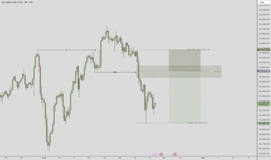 Liquidity grab cleared, followed by a break of structure to the downside and a fair value gap (FVG) that aligns perfectly with my 71% Fibonacci retracement - this is very good setup for me. I’ve set a sell limit at 23,513, with a stop loss at the 100% Fibonacci level and take profit at the 0% level, giving a fixed risk-to-reward ratio of 2.45. NAS100
