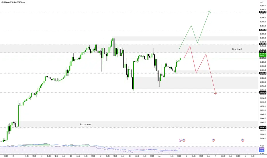 NAS100 is currently testing a key zone called the Pivot Zone (a direction-determining area). The short-term trend will be determined by whether the price manages to stay below or break above this zone.
