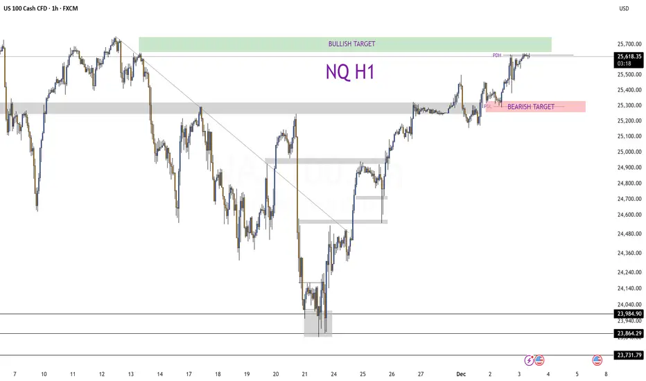 Currently, Nasdaq is sitting below a strong resistance zone; price appears to be weakening, which increases the probability of a short-term pullback toward the Previous Day Low (PDL) to collect more liquidity before any further upside attempt.