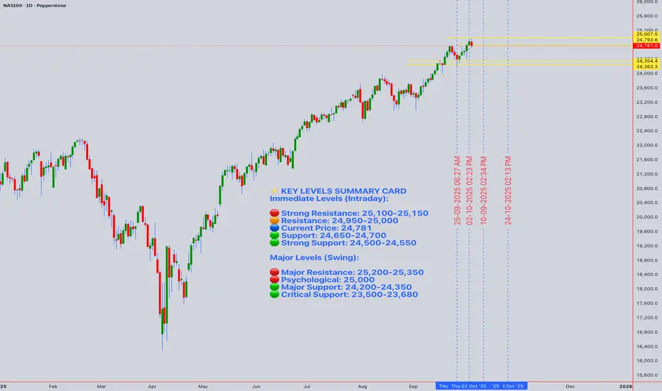 The NASDAQ 100 is currently trading at 24,781.00, showing resilience near all-time highs. This comprehensive analysis integrates multiple technical frameworks to provide actionable insights for both intraday and swing traders navigating the tech-heavy index.
