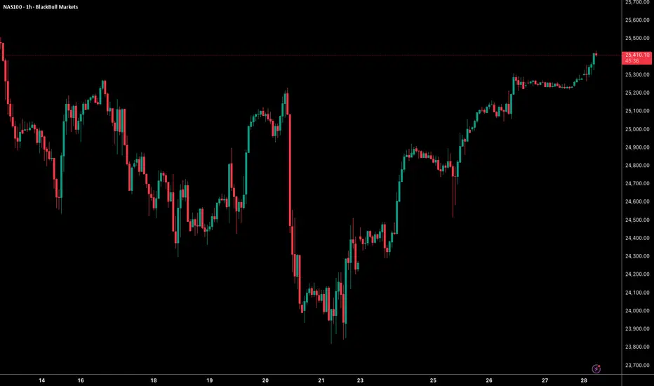 NAS100 continues its strong rebound after the sharp drop from the 21st. Price has now broken above the 25,350 level, showing sustained bullish momentum with higher highs and higher lows forming throughout the week.