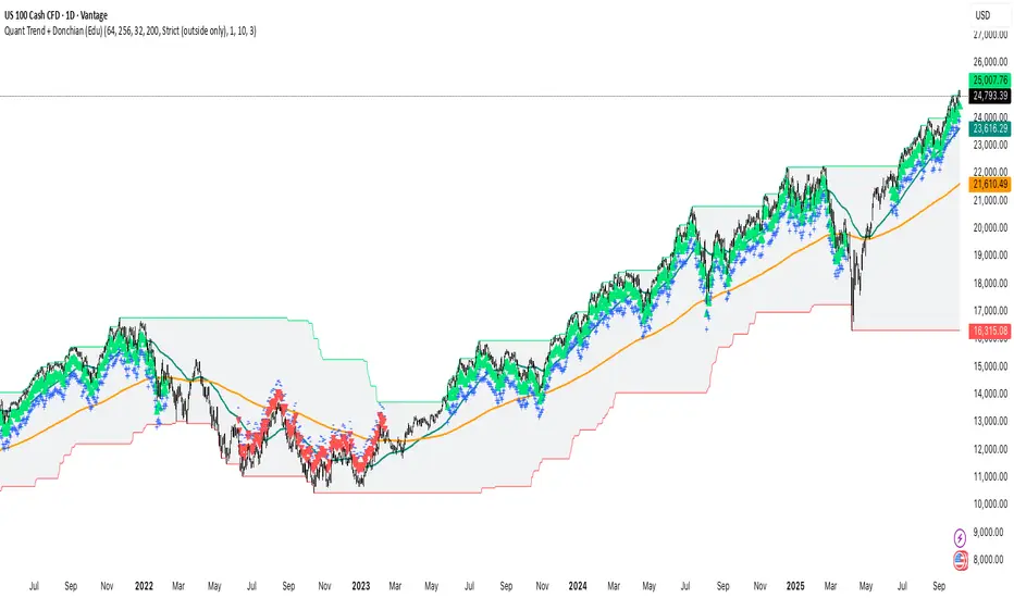 This educational chart uses the public Quant Trend + Donchian indicator to visualize how trend-following and breakout logic can define market regimes in NASDAQ 100 & S&P 500.