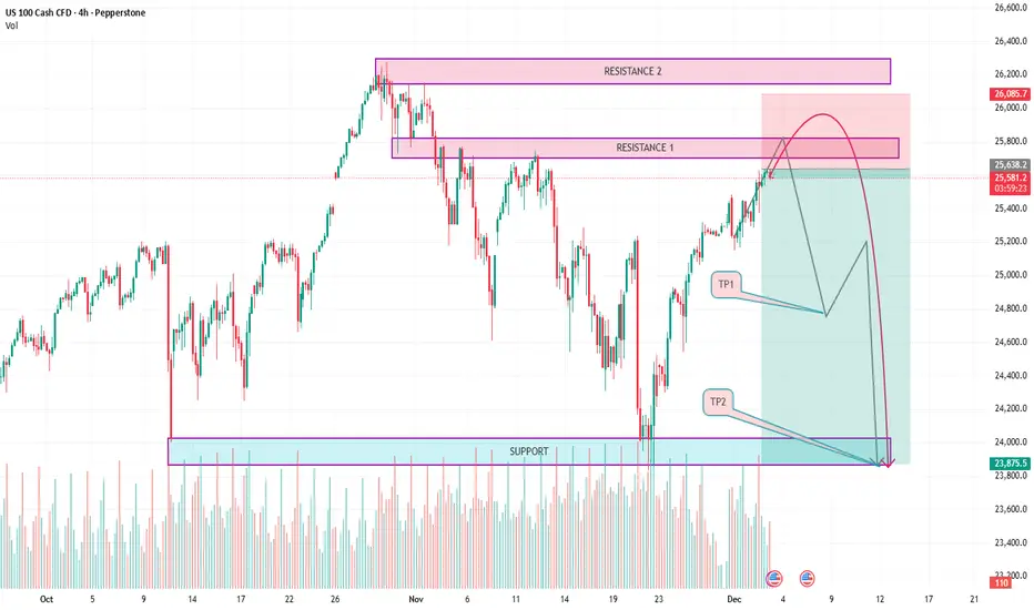 * **Entry Zone:** The projected entry is shown near the **Resistance 1** and slightly into the **Resistance 2** area, suggesting a wait for the price to peak out after the current rally. The proposed entry seems to be between $\text{R1}$ and $\text{R2}$, around the **25,800 - 26,000** area, where the curved path begins its descent.