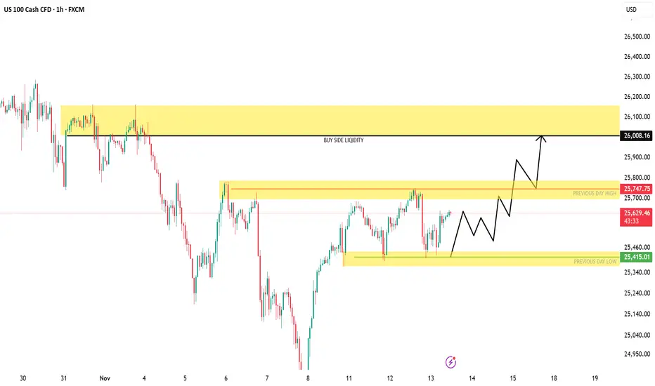 NASDAQ (US100) is consolidating between 25,400–25,750, forming a potential accumulation zone below short-term liquidity. A clean break and retest above 25,750 could trigger a bullish expansion toward the 26,000–26,200 range, where major buy-side liquidity sits.