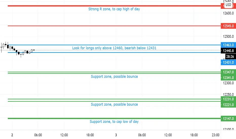 Below 12431, look to sell to 12341-47 and 12221-31. Both are strong support zones and should offer a bounce. 12147 should cap low of day.