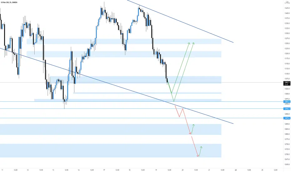 Yesterdays analysis was a total flop. A couple of guys commented and pointed out the M formation which I should have incorporated into my analysis. While my analysis was wrong, I was luckily able to catch the drop and make some decent profits. Part of growing as a trader is being able to admit when you're wrong and owning it instead of being arrogant and only showing off the winning days. Hopefully onwards and upwards from here. For today I've marked possible areas for a reversal (between 13007 - 12960) and then areas where price may head in the case of a break of the trendline. Good luck to everyone for today ✌🏼