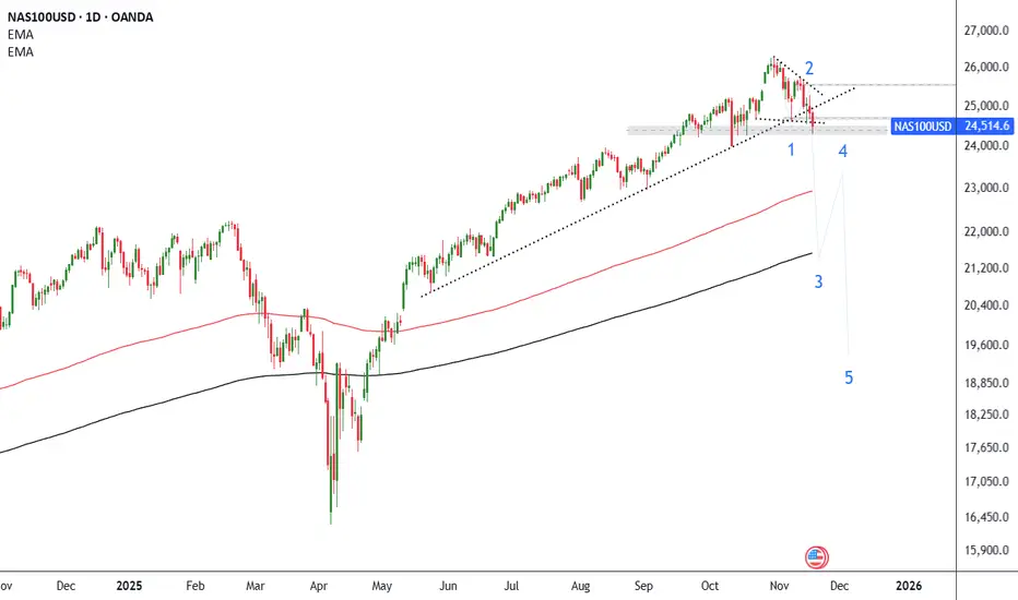 The Nasdaq 100 index has retreated toward a key area after a clear break below the ascending trendline that has held since mid-year, reinforcing expectations of a broader corrective wave. The current decline below the 25,000 – 24,600 zone indicates weakening bullish momentum, especially after breaking the previous low (Point 1), which supports the outlook for the index to move within a multi-leg bearish structure (five-wave decline).