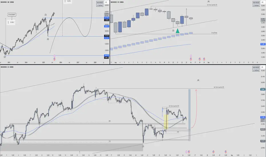 NAS100 looks corrective after a strong multi-month bullish wave. Near-term, liquidity sweep setups favor a bounce into 23,800+ as long as 23,000 holds. Medium-term, Wave (4) correction could extend deeper into 22k–20k levels before the next major bullish wave.