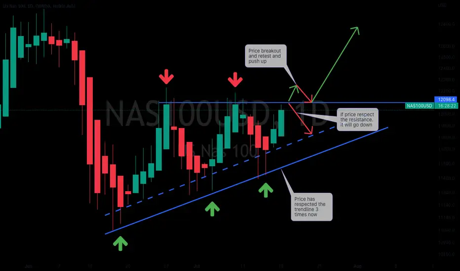 My analysis on NAS 100 from a daily chart. The market is still bearish. This analysis are done within a down channel. if the price breakout from the resistance level. It will push to challenge the outer trendline.