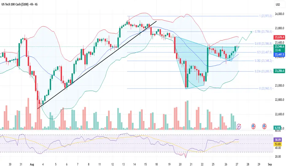 Therefore, if prices breaches the immediate resistance at 0.618 Fib level (23586), then the US tech index will continue its bullish momentum toward 23756–23,970.