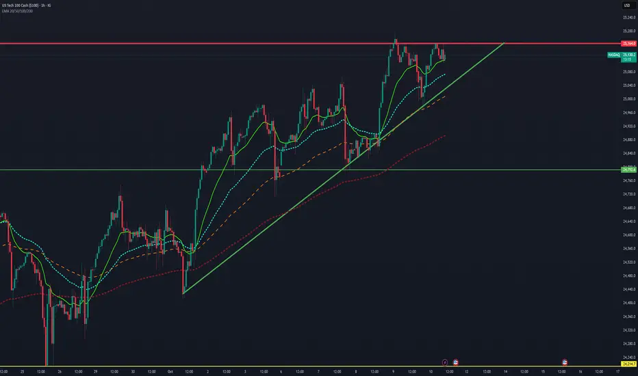 Resistance: The most critical level is the horizontal red resistance line at approximately 25,160.0. The price is currently challenging this level and has touched it multiple times without a decisive breakout to new highs. A confirmed break above this level would signal a continuation of the rally.
