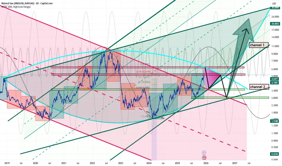 we have definitively broken out of the descending channel. Currently, the market is facing two potential upward channels. The breakout from the red triangle will determine which of these channels we will follow. Based on anticipated global economic conditions and the market’s geometric dynamics, channel 2 appears to be the more logical trajectory. Price movement toward the borders of channel 2 has so far respected the integrity of the 6-month candle.