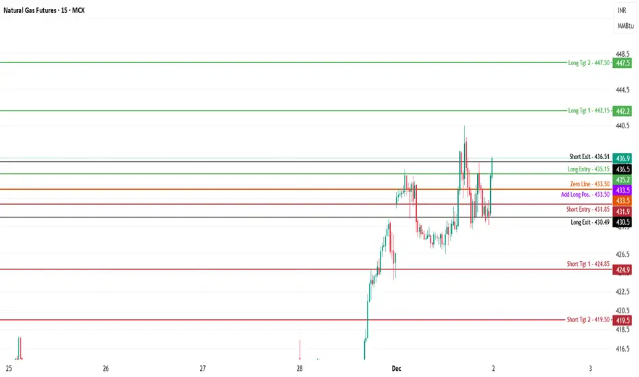 Longs activate above the Long Entry level at 435.15, with stronger conviction as price sustains above the zero line at 433.50 and Add Long Position zone at 433.50–433.5.​​
