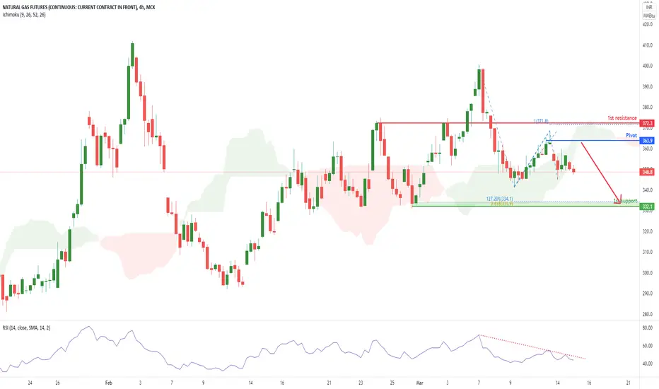 Preferred case: We see the potential for a further bearish drop from our Pivot at 363.9 in line swing high resistance towards our 1st support at 332 in line with 127.2% Fibonacci projection and 61.8% Fibonacci retracement. Our bearish bias is further supported prices trading below our ichimoku clouds.