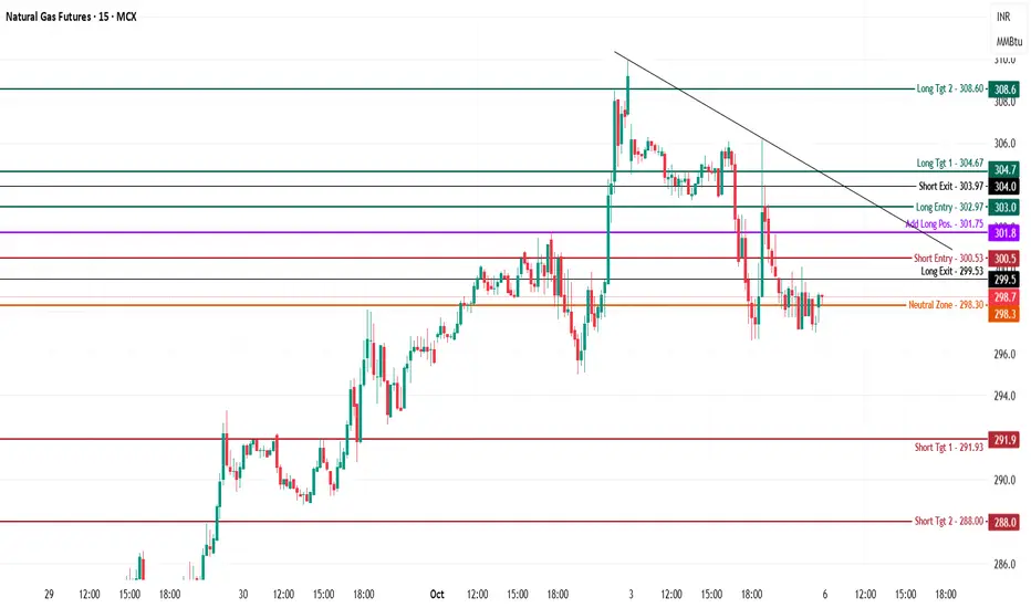 Natural Gas is trading at 298.7, consolidating below recent resistance and major supply after a minor downtrend, with price action holding around the neutral zone and awaiting a directional breakout.