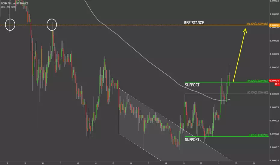 Recently NCash has found the bottom at 214 satoshis area. There it formed a double bottom, after which price went up and broke above the descending channel. Today NCASH/BTC broke above the 200 Moving Average, suggesting the beginning of an uptrend.