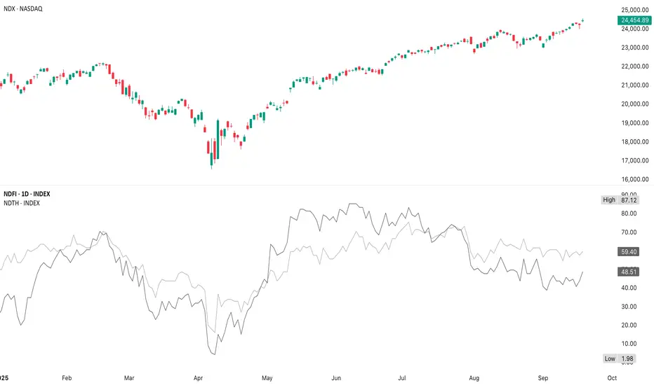 - NDFI (around 48.5) shows % of NDX stocks above 50d MA (breadth)