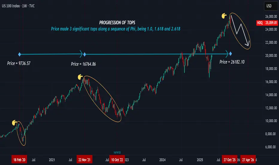 * If we project a sequence of thirds, (1/3, 2/3, 3/3), then the three tops from 2009 made an expanding sequence along 3/3, 5/3, and 8/3 nodal points, at 9736.57, 16764.86 and 26182.10 levels respectively. Each node effected a correction, and by projection, we expect price to correct steadily until late April 2026. (1,2,3,5,8...) points form the price tops. The zone between 26182.1 and 26880.XX will be our confluence zone to expect a decline.