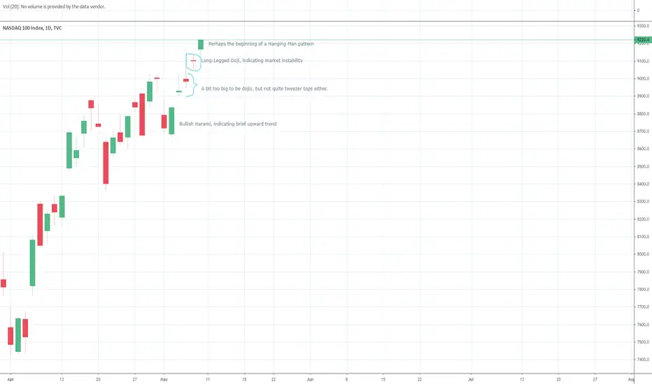 Very new to technical analysis, sorry. Trying to analyze candlestick patterns and it seems there is a bit of market instability with a doji and a possibility of the formation of a hanging man. Predicting a bearish trend for the next few days. Thoughts?