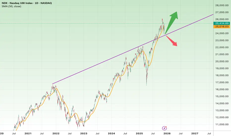 The chart shows that the Nasdaq 100 has been in a strong multi-year uptrend from 2023 to 2025 and is now touching a major long-term ascending trendline (purple line).