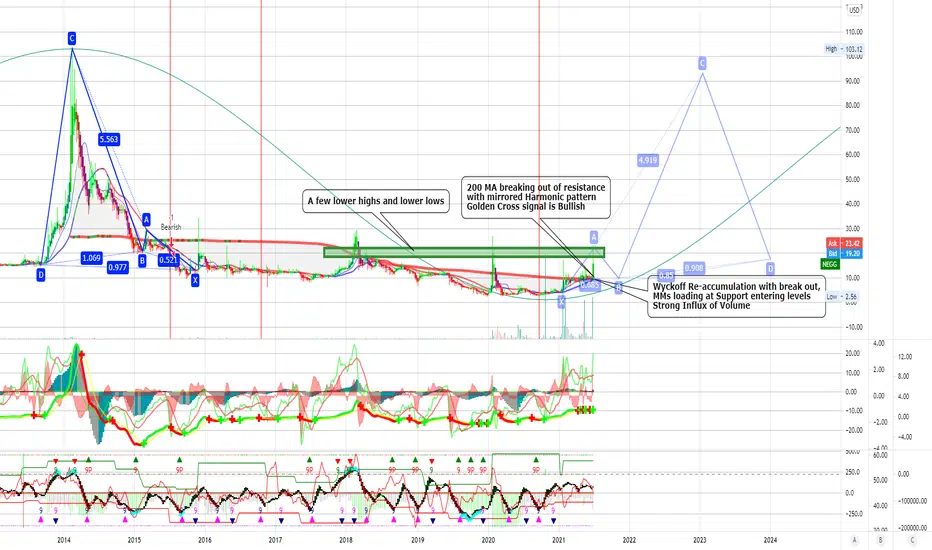200 MA breaking out of resistance, a few lower highs and lower lows with mirrored Harmonic pattern