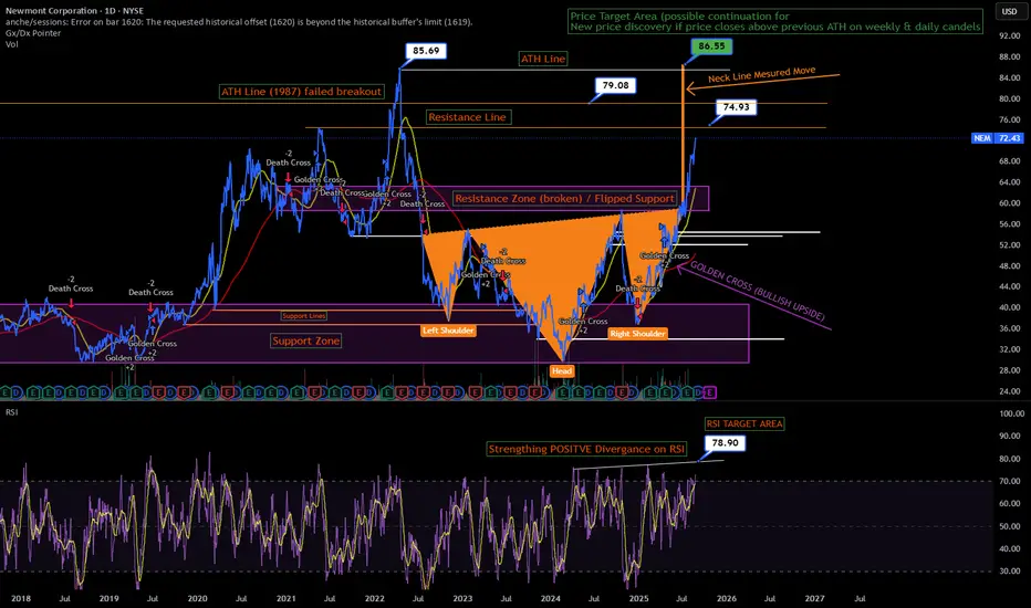 Look to a pullback in RSI to see when the bullish buying and strength fades away but it will be excellent to see a conformation with some closes above the previous ATH on the 1 day or weekly candle charts. the golden Cross moving averages are with the 50 day vs the 200 day cross over indicating that a bullish golden cross is in full effect, i expect the measured move to complete along side some minor pull backs around the resistance levels, those dips should be brought into with strategic profit taking around the key levels, I wouldn't say exit NEM after completion more profit take and remain cautious until conformation of a new confirmed ATH breakout. 2026 could see a continuation grind to new heights around $100+ per share but will need to reinvestigate the double top breakout once played out after EOY.