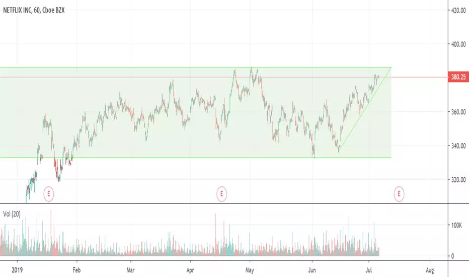 Netflix has been stuck in a horizaontal parallel channel. Indicators look mostly good, but momentum is flagging as it approaches the top of its channel. It should continue upward if it breaks 385.91 on volume.