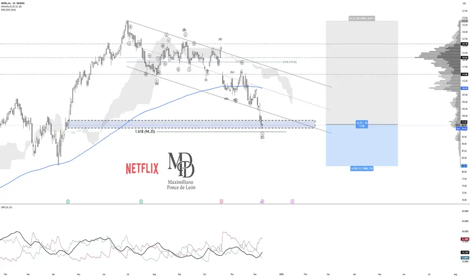 Possible end of the corrective ABC in NFLX, reaching the 1.618 extension of wave C and reacting in a Demand zone. Entries here seem reasonable with a stop-loss at 82 USD.