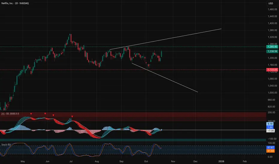 Market Structure: Netflix (NFLX) printed a powerful rebound candle off the $1,134–$1,160 demand zone, signaling renewed buying interest. This level has acted as a structural support in multiple swing cycles. The daily chart shows a recent BOS (Break of Structure) after a series of CHoCH formations, suggesting that smart money may be repositioning long after liquidity was swept below October lows.