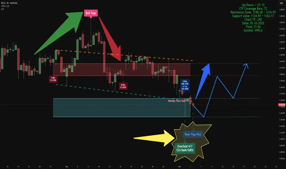 On the latest candle, a Bear Trap Risk signal appeared right after detecting an OverSold condition. This combination usually suggests weakening selling pressure near the end of a bearish leg and indicates the potential for buyer reaction. At that candle, both buy and sell volumes reached their highest values within the 52-bar window, but sellers maintained a slight advantage — approximately 260K sell volume versus 210K buy volume. This dominance by sellers in the OverSold zone reinforces the concept of volume exhaustion