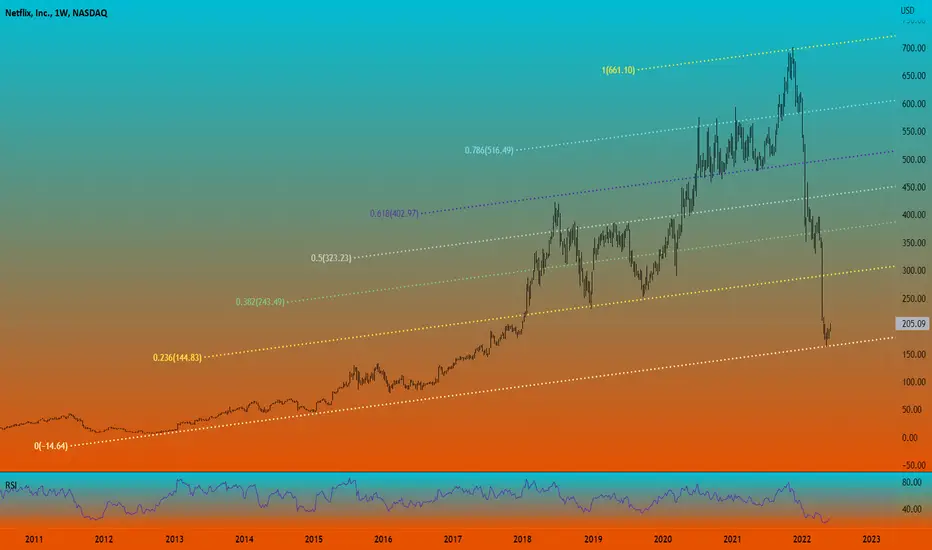 This is a weekly NFLX chart with the Fibonacci Channel applied to it dating back to the 2012 timeframe.