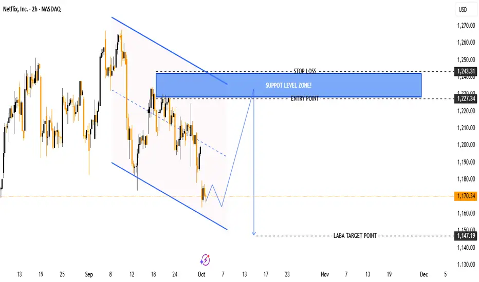 This chart suggests Netflix (NFLX) is in a downtrend within a descending channel. A pullback to the $1,227–$1,243 zone could offer a shorting opportunity targeting $1,147, with a strong risk/reward ratio.