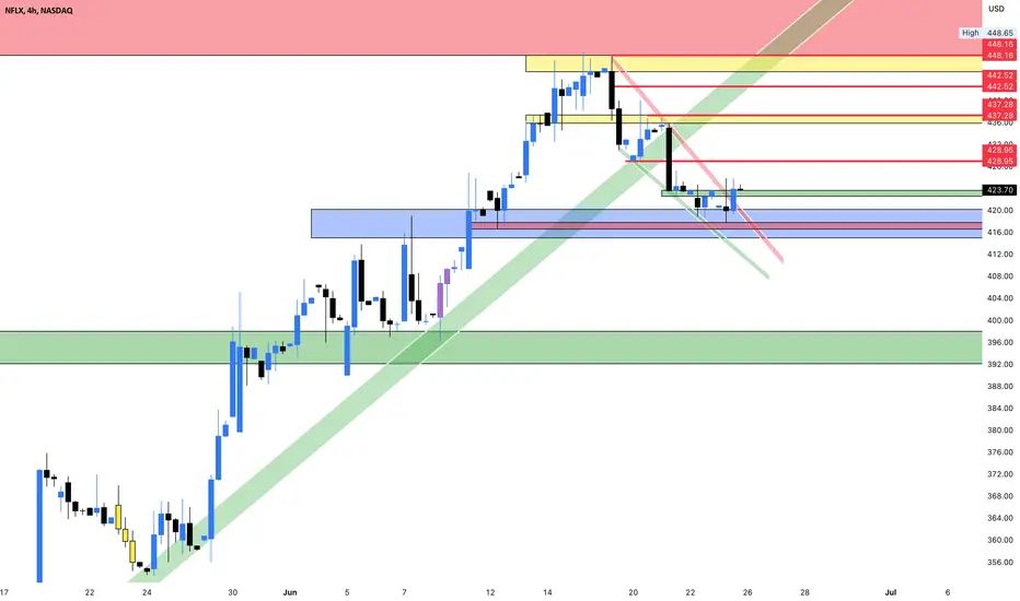 NFLX has returned to a strong demand area on the 1h/4h charts. Price has created and completed a falling wedge into this demand area, in confluence with the fibonacci golden zone (50%-61.8%). This retracement comes after an uptrend break that began back on May 17th. Price either looking to make a double top by returning to the highs of the falling wedge or it could fail and continue downward.