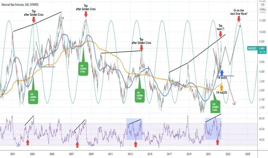 I've plotted the Sine Waves on the chart to more efficiently illustrate NG's long-term cycles. Currently it is within a Bull Cycle having formed a Golden Cross (MA50 crossing above the MA200) last June. However after every 1W Golden Cross since 2000, the market made a Top shortly after. This was disrupted this year due to the Ukraine-Russia war and as a result the price negated the peak of October 2021 and broke outside the Sine Wave.