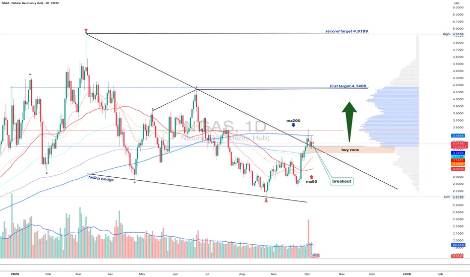 On the daily chart, Natural Gas has broken out of a falling wedge, but price remains below the MA200, while EMA still hovers above it - a mixed signal showing short-term hesitation within a longer-term downtrend.