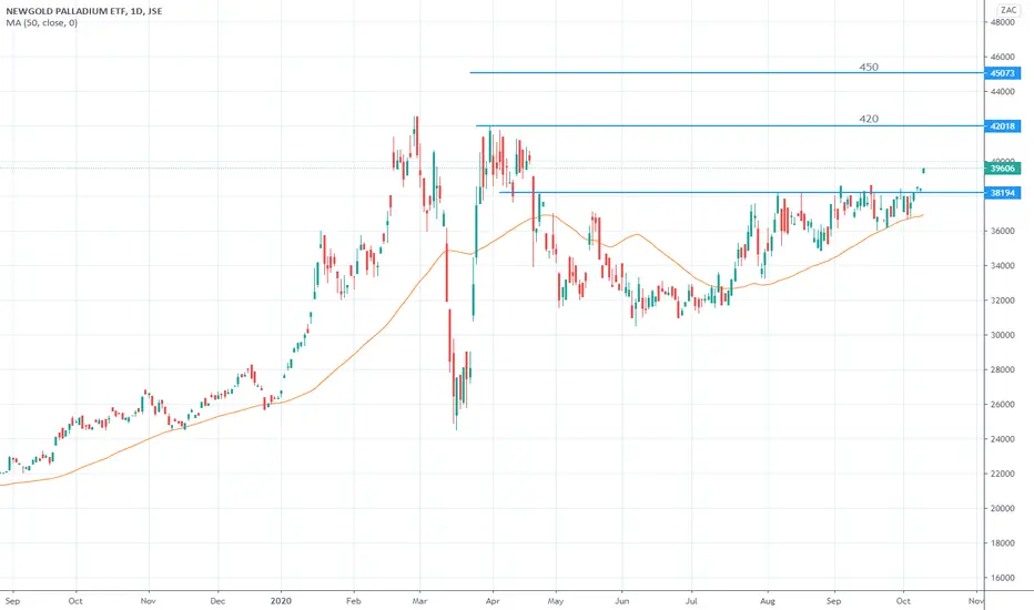 Inverted head and shoulders top flat top triangle break. Targets 420 & 450. Stop loss break below 373.