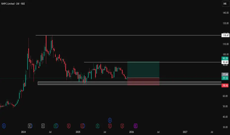 On the weekly timeframe, NHPC is trading near a well-defined demand zone, where price has previously shown buying interest. The stock is currently attempting to stabilize after a corrective phase, indicating potential accumulation at lower levels.