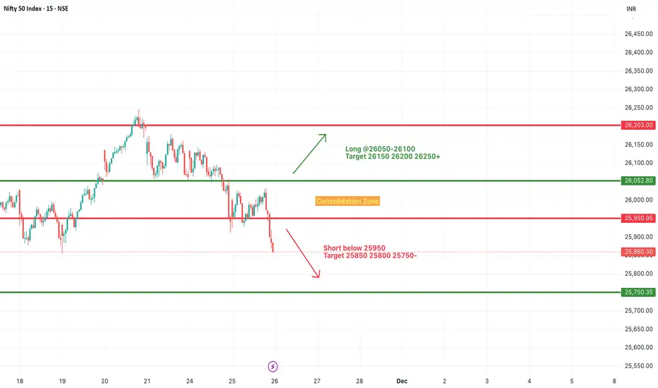 Nifty is expected to open with a gap-up today, and if the index sustains above the 26050 level, bullish momentum may continue in the early part of the session. A stable move above the 26050–26100 zone will activate the long setup with upside targets of 26150, 26200, and 26250+. If buyers remain strong, the move can further extend toward the higher resistance zone.