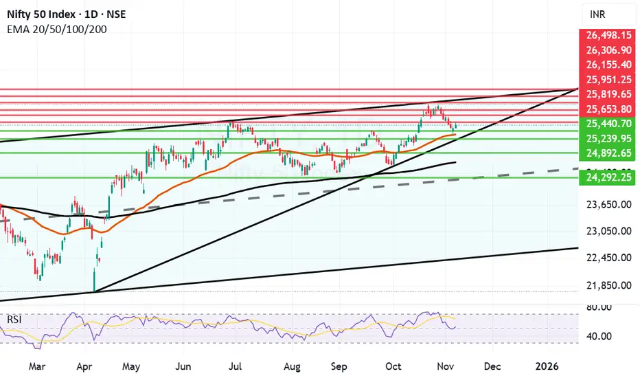 Nifty today gave a good follow-up candle after Friday's green candle where it confirmed Mother line support. Nifty today closed at 25574. Nifty made a high of 25653 but could not hold 25650 level which was very important for further progress. Once Nifty gives a closing above 25653 now we can see further positivity in the market. The resistances for Nifty remain at 25653, 25819, 25951 and 26155. The channel top for Nifty is in the zone of 26306 to 26498 if we and when we get a closing above previous all time high of 26277. Supports for Nifty now remain at 25440, 25338 (Mother line support) and 25239. A closing below 25239 can bring further weakness which can drag Nifty towards 24892, Father line support of 24660 or even 24292 which is currently the mid channel support. As of now shadow of the candle looks positive and RSI is also turning bullish.
