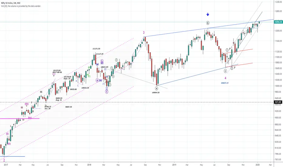NIFTY50 closed the week @ 12352.35 and moved above last weeks high, which was a „hammer-candle“ and it is bullish. Any price action below the hammer´s candle low @ 11929.60 open the door to much higher price still, `cause a hammer candle reflects 3-5 weeks (at this case) of advancing price. This weeks high touched the upper rising trendline, blue, and closed above the high of last week's candle. So, a pop above 12389.05 is the door opener for new ATH in the coming days and weeks.
