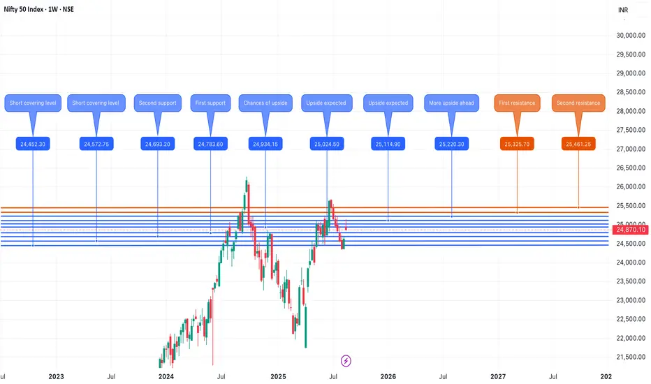 Nifty is looking positive and it is expected to continue last week's momentum , but it will face some resistance moving forward at 25050-25100. If Nifty sustains above these levels, then we can expect momentum to continue upto 25350-460 . But if it fails to cross and sustain above 25050-25100 range, then we can expect sell-on rise keeping Nifty range-bound and volatile throughout the week.