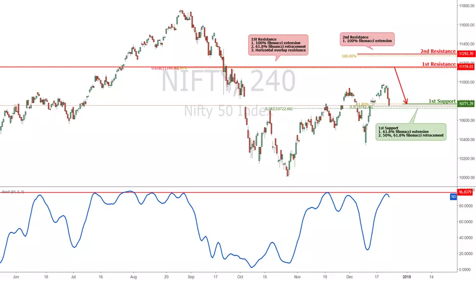 NIFTY is approaching our first resistance at 1159.03 (horizontal overlap resistance, 100% Fibonacci extension, 61.8% Fibonacci retracement) where a strong drop might occur below this level pushing price down to our major support at 11292.70 (100% Fibonacci extension).