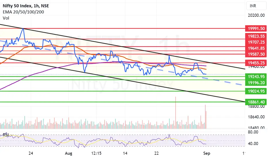 Nifty delicately placed at Mid-Channel line support. Nifty closed below very important 50 days EMA support or the Mother line. 19196 to 19243 is the next support zone. Closing below 19196 will open the floodgates for bears and the next support level will be near 19024. Below 19024 the support zone will be between 18456 and 18861. So the negativity for Nifty looks empowering and impending. However in case there is a reversal from mid-channel line which looks little difficult but in case that happens resistances on the upper side are 19354 and 19405 which are the 50 and 200 Hours EMA respectively.