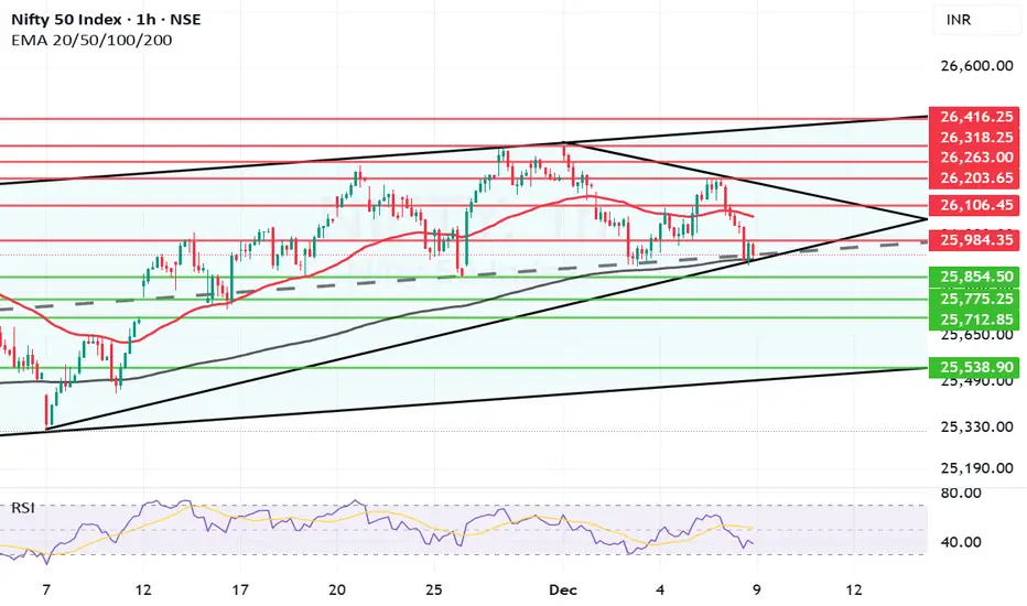 Supports for Nifty are at 25915 (Major Father line support). If this support is broken Nifty will become weak and can further plummet towards 25854, 25775 or even 25712. The channel bottom support for Nifty will be near 25538.