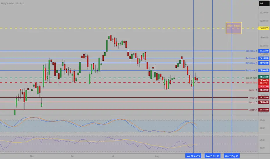 Given the anticipated gap-down opening on Monday, caution is advised for bearish entries, as the market may open lower and exhibit intra-day bullish recovery. However, if the RSI falls below 60, there may be opportunities to position for a target around 25,100. Timing will be crucial, but there exists potential for bears to take advantage of the movement.